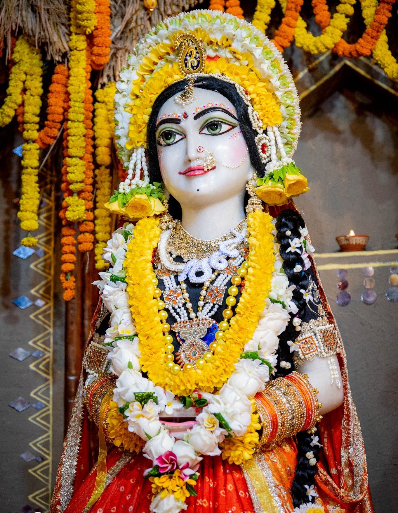 Indulekha is the sixth of the varistha sakhis. Her complexion is bright yellow, and her attire is like the color of the bright red flowers of the pomegranate tree. Of the sakhis, she is appointed in making ornaments, making dresses, protecting the treasury, and entrusted to take care of all the enchanting places of Vrindavana.