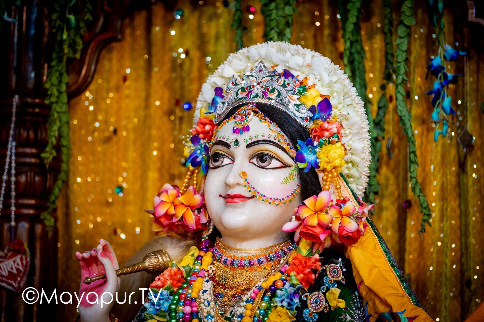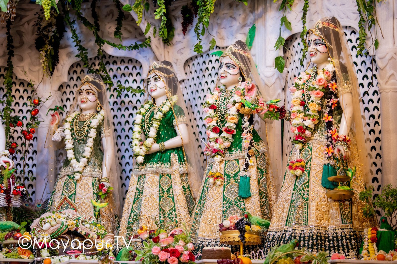 Information – The beautiful larger than life size Sri Sri Radha Madhava, surrounded by Their Ashta-sakhis (eight principal gopi friends) — Sri Lalita, Sri Champakalata, Sri Chitra, Sri Tungavidya, Sri Vishaka, Sri Indulekha, Sri Rangadevi and Sri Sudevi.