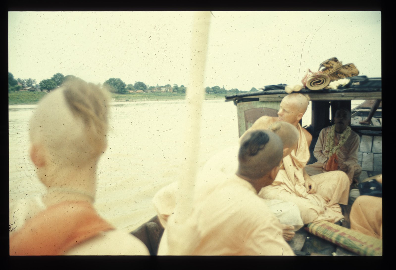 Tamal Krishna Mahārāja helped Śrīla Prabhupāda on board over the rickety bamboo ramp. Prabhupāda carefully inspected every corner of the boat. Then he sat for a few minutes on a straw mat, while the devotees held kīrtana. Prabhupāda likes the idea of preaching on the boat, and he encouraged Sudāmā Mahārāja to make it a success.