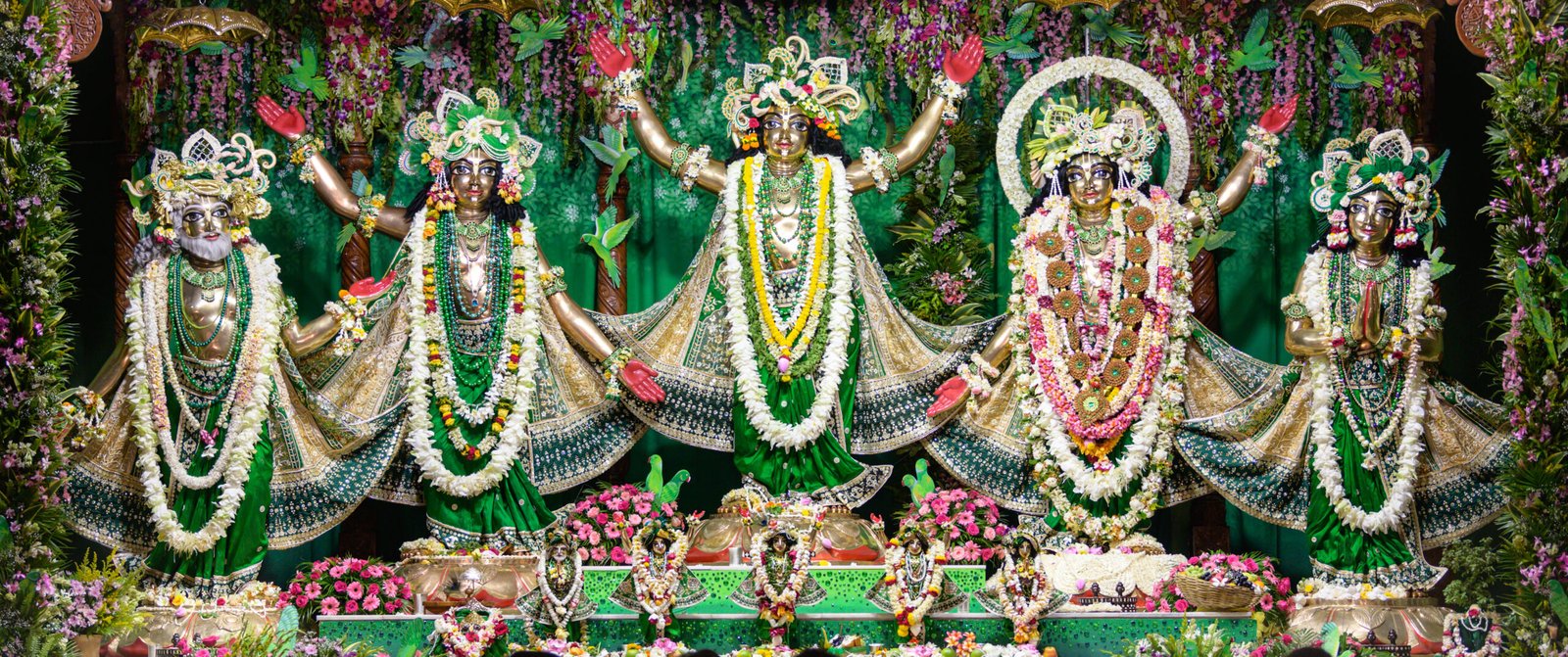 “In the Age of Kali, people who are endowed with sufficient intelligence will worship the Lord, who is accompanied by His associates, by performance of saṅkīrtana-yajña.” (SB 11.5.32) Śrī Caitanya Mahāprabhu is always accompanied by His plenary expansion Śrī Nityānanda Prabhu, His incarnation Śrī Advaita Prabhu, His internal potency Śrī Gadādhara Prabhu and His marginal potency Śrīvāsa Prabhu. He is in the midst of them as the Supreme Personality of Godhead.