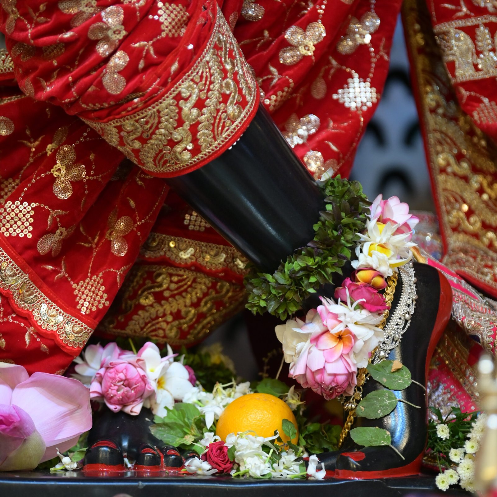 “Then he made a gesture with his hands, the same gesture as Rādhārāṇī, and he said, ‘Rādhārāṇī will be dancing, because when She is dancing, Kṛṣṇa can never leave Her.’ He then gave the dimensions for Radha-Madhava and the other deities. He said, ‘Kṛṣṇa will be six feet four inches. Rādhārāṇī should be five foot ten inches.’ (‘He’ refers to Srila Prabhupada)