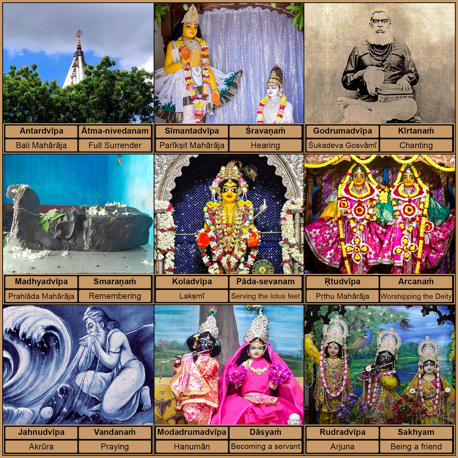 The present Navadvīpa-dhāma is but a part of the whole of Navadvīpa. Navadvīpa means “nine islands.” These nine islands, which occupy an area of land estimated at thirty-two square miles, are surrounded by different branches of the Ganges. In all nine of those islands of the Navadvīpa area there are different places for cultivating devotional service. It is stated in Śrīmad-Bhāgavatam (SB 7.5.23) that there are nava-vidha bhakti, nine different activities of devotional service: